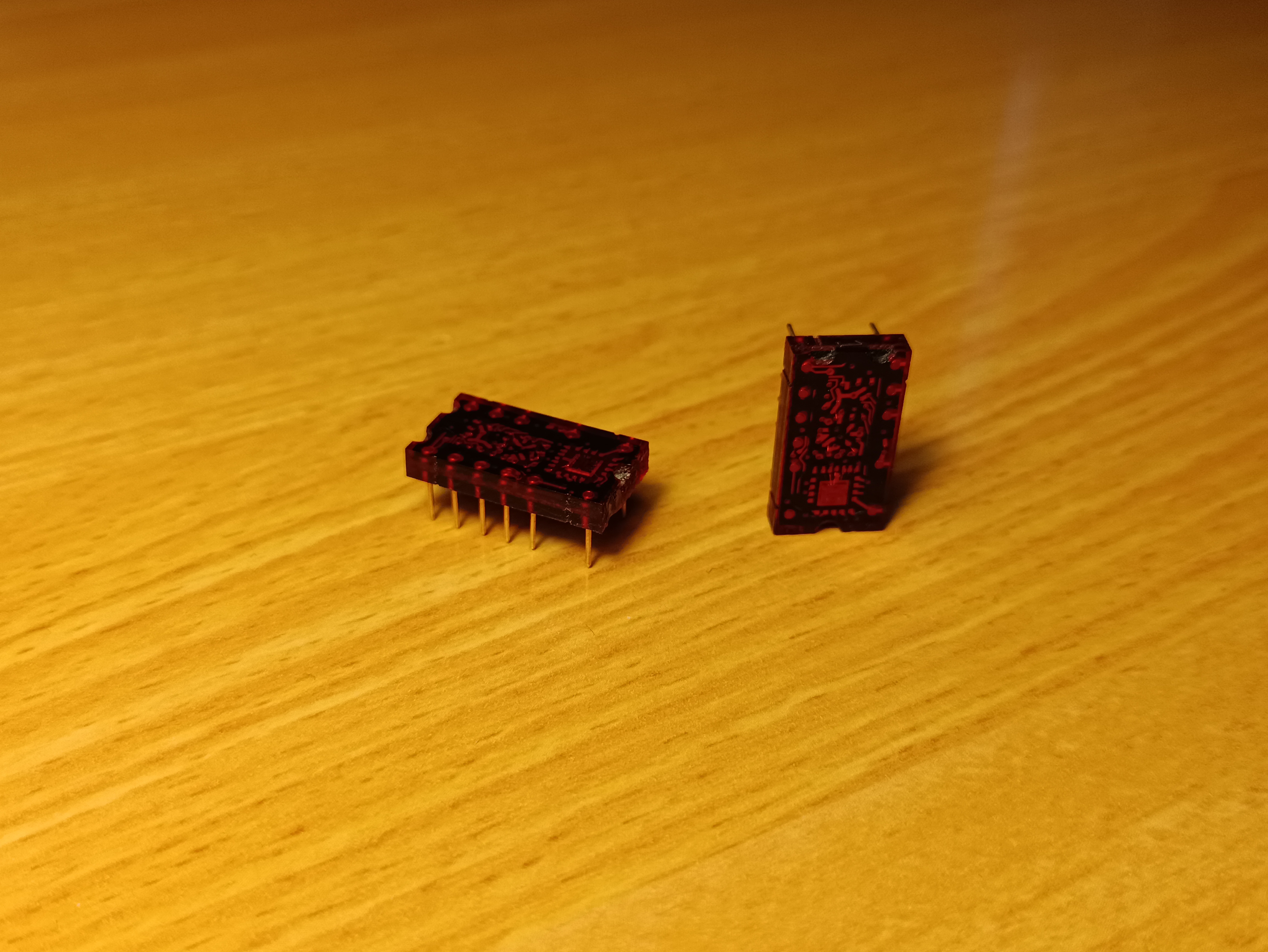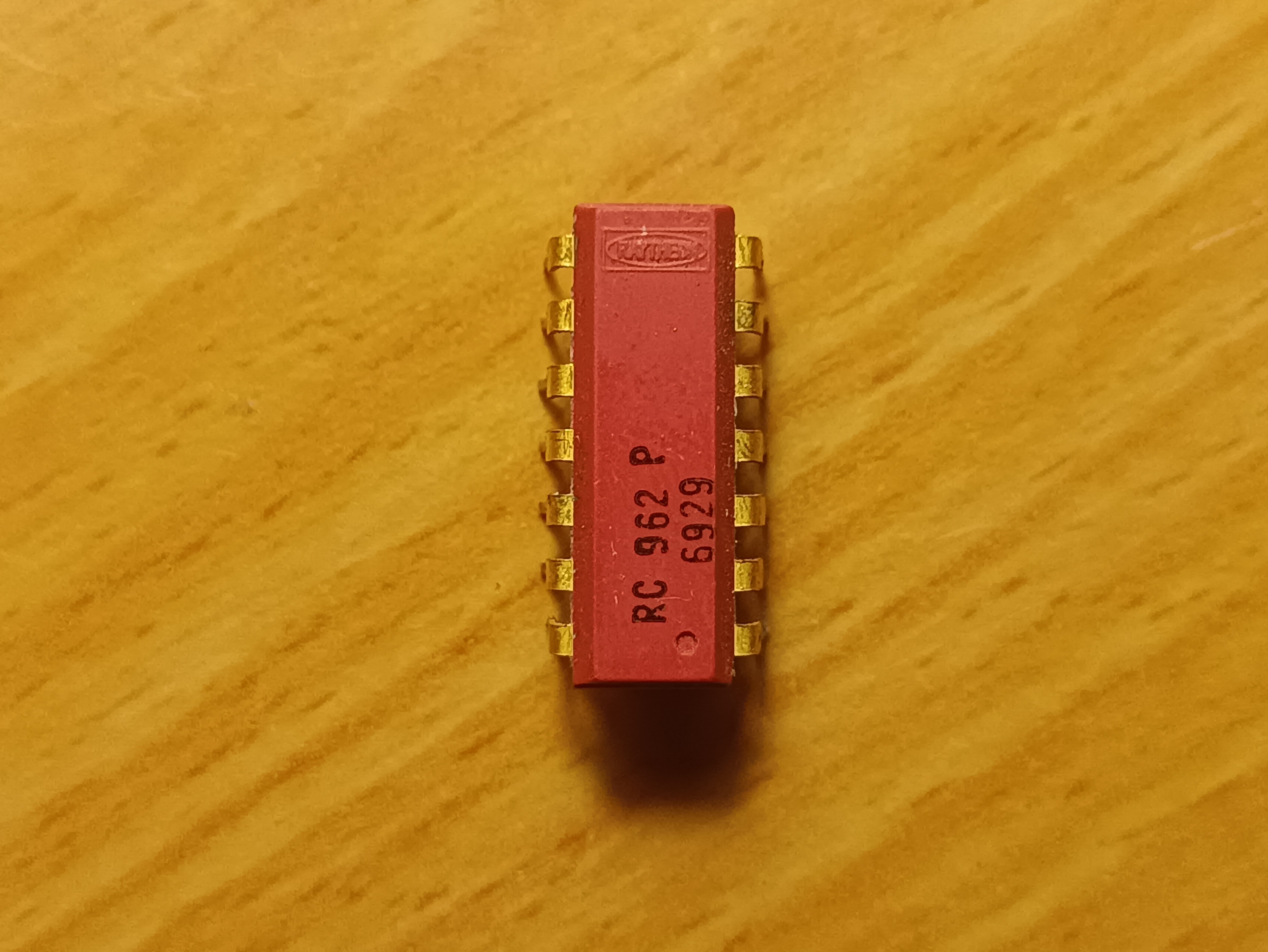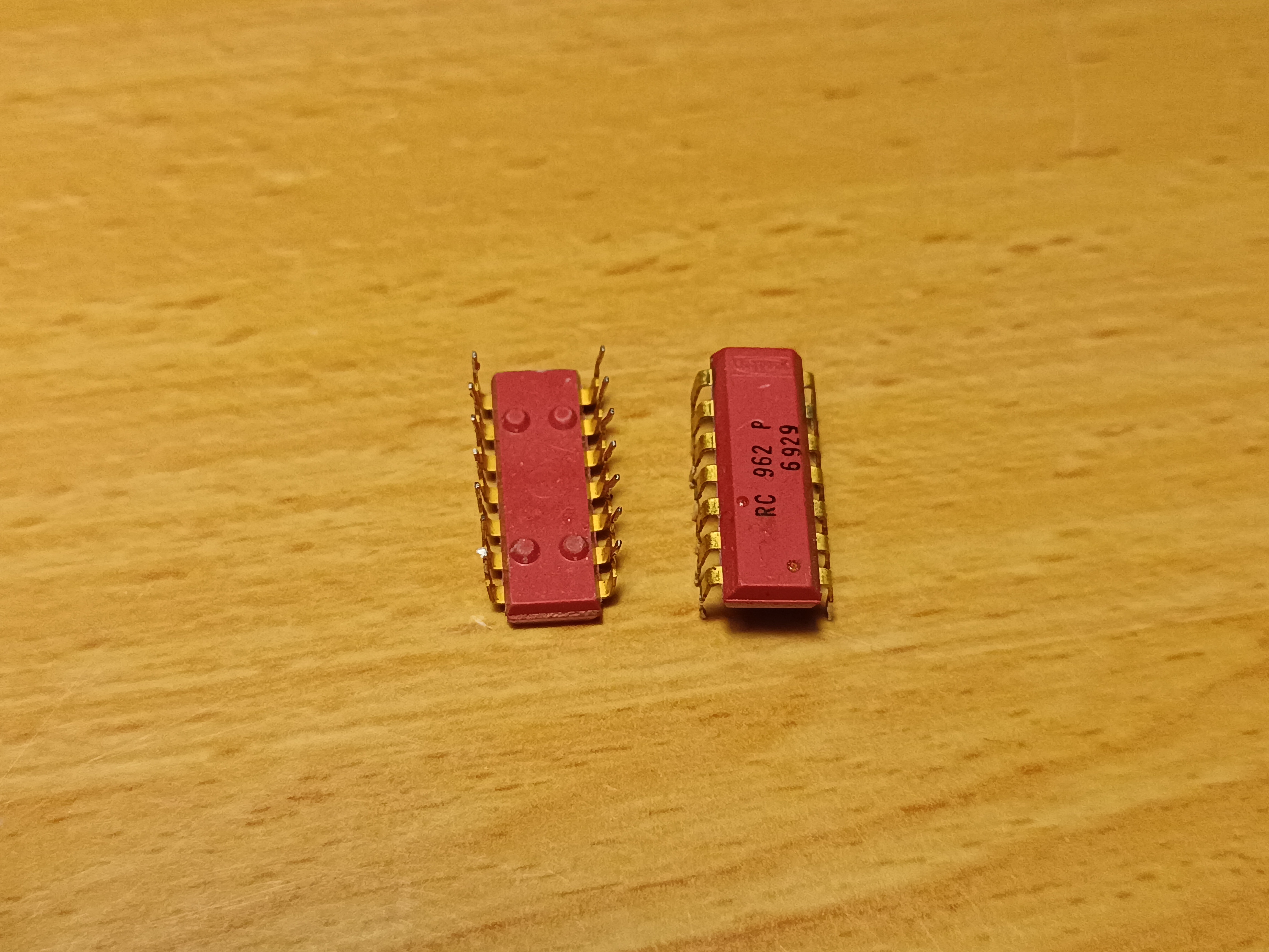 These chips are Raytheon-manufactured equivalents to the MC962, which I believe to be manufactured in week 29 of 1969. No datasheet for this exists on the web, but I have found a Motorola DTL logic product catalog that contains some datasheet-adjacent information for the MC962, including pin functions. These red-pink (rink?) chips are working, contain three triple-input NAND gates, and have the same pinout as the 74x10 logic chip. The pins are gold-plated and have a "1" shaped hole in pin 1. Due to the unscrupulous ethics of the manufacturer, I refer to these as sinister semiconductors.