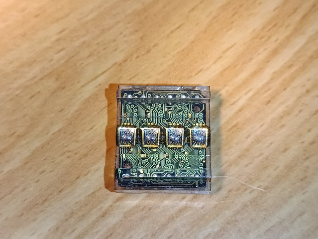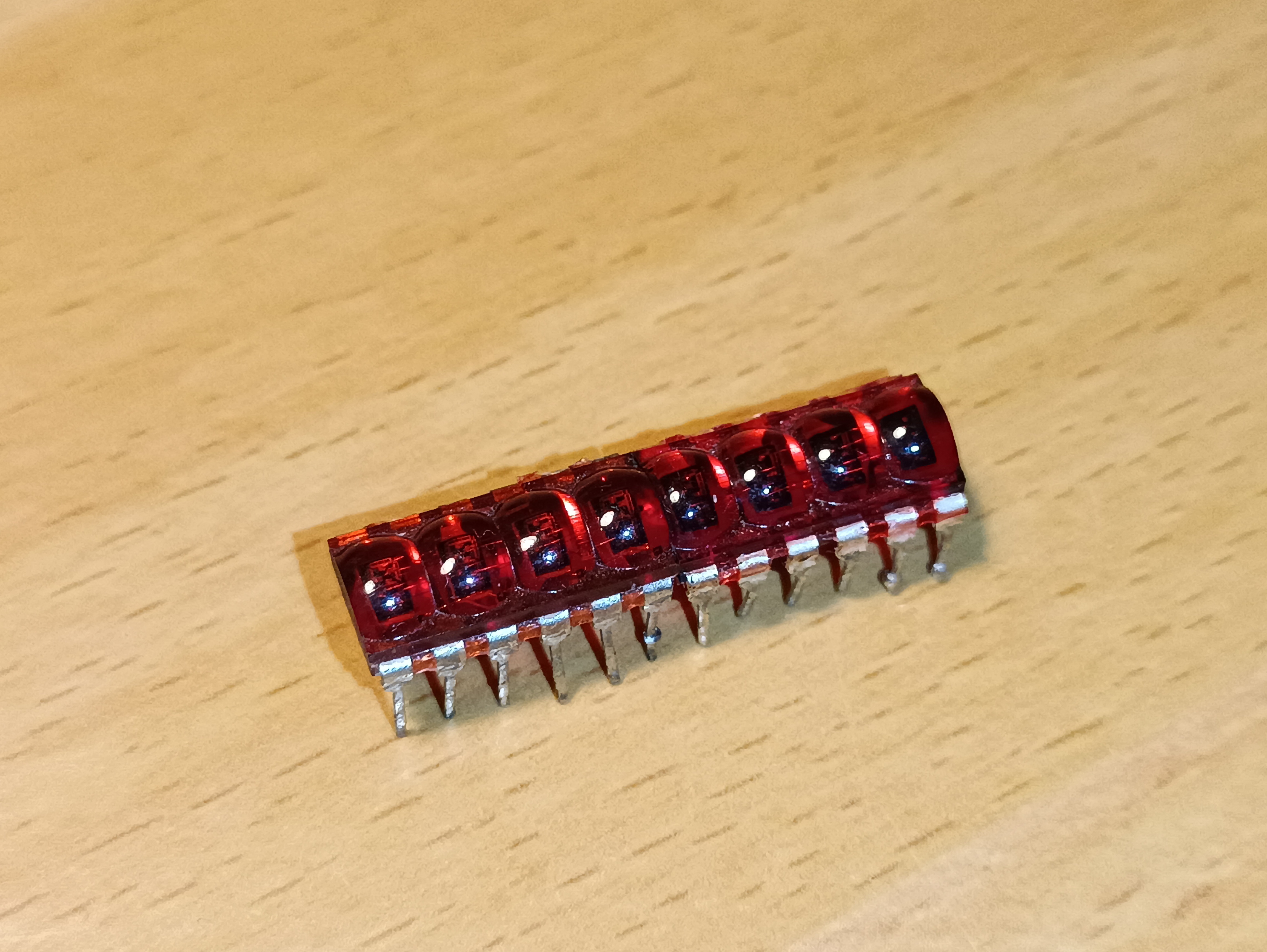 Smart LED display with four 16-segment digits. Takes input using a 2-bit digit selection bus and a 7-bit data bus for ASCII character selection. The integrated circuit that decodes the input