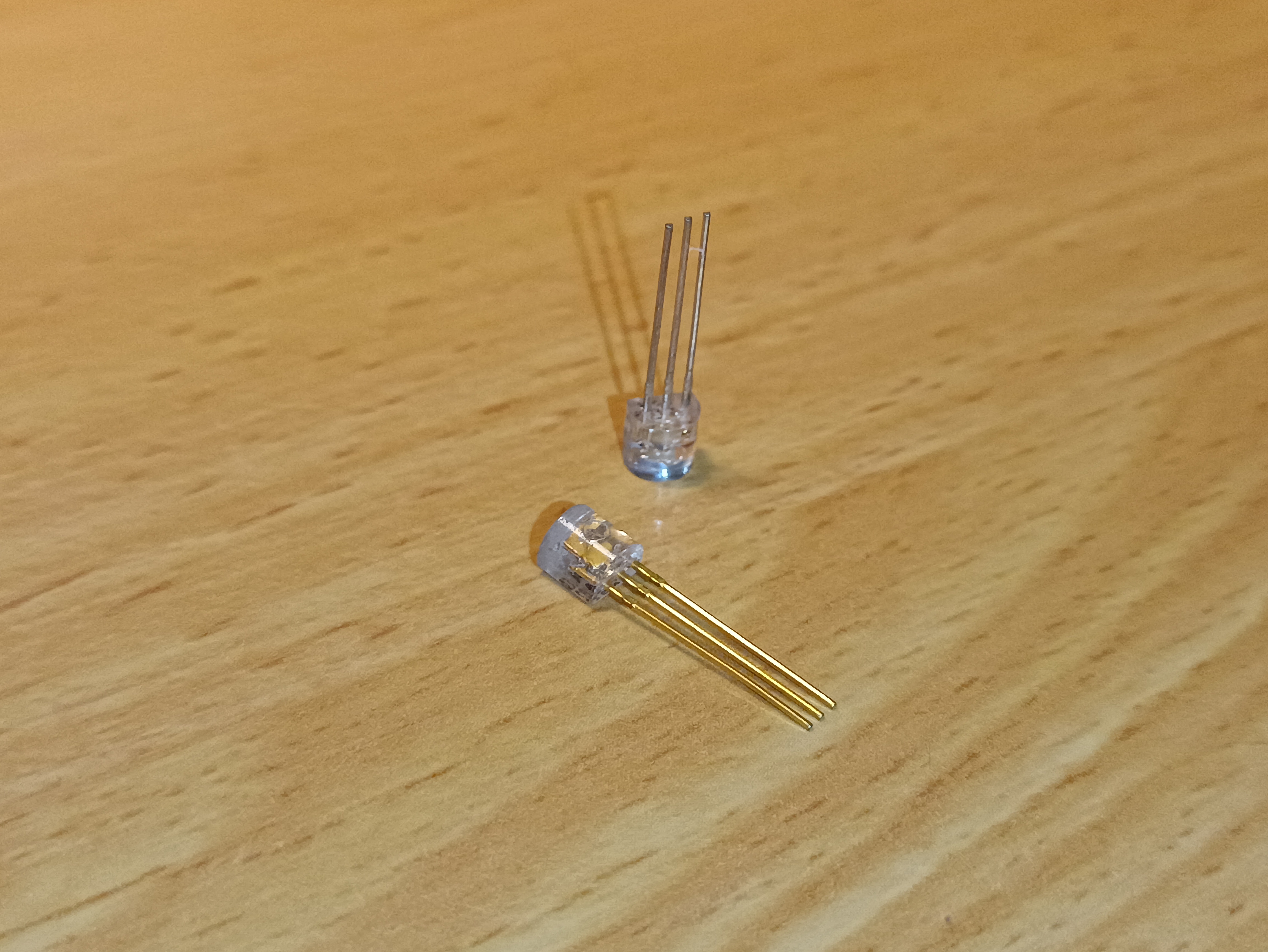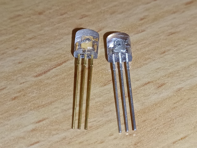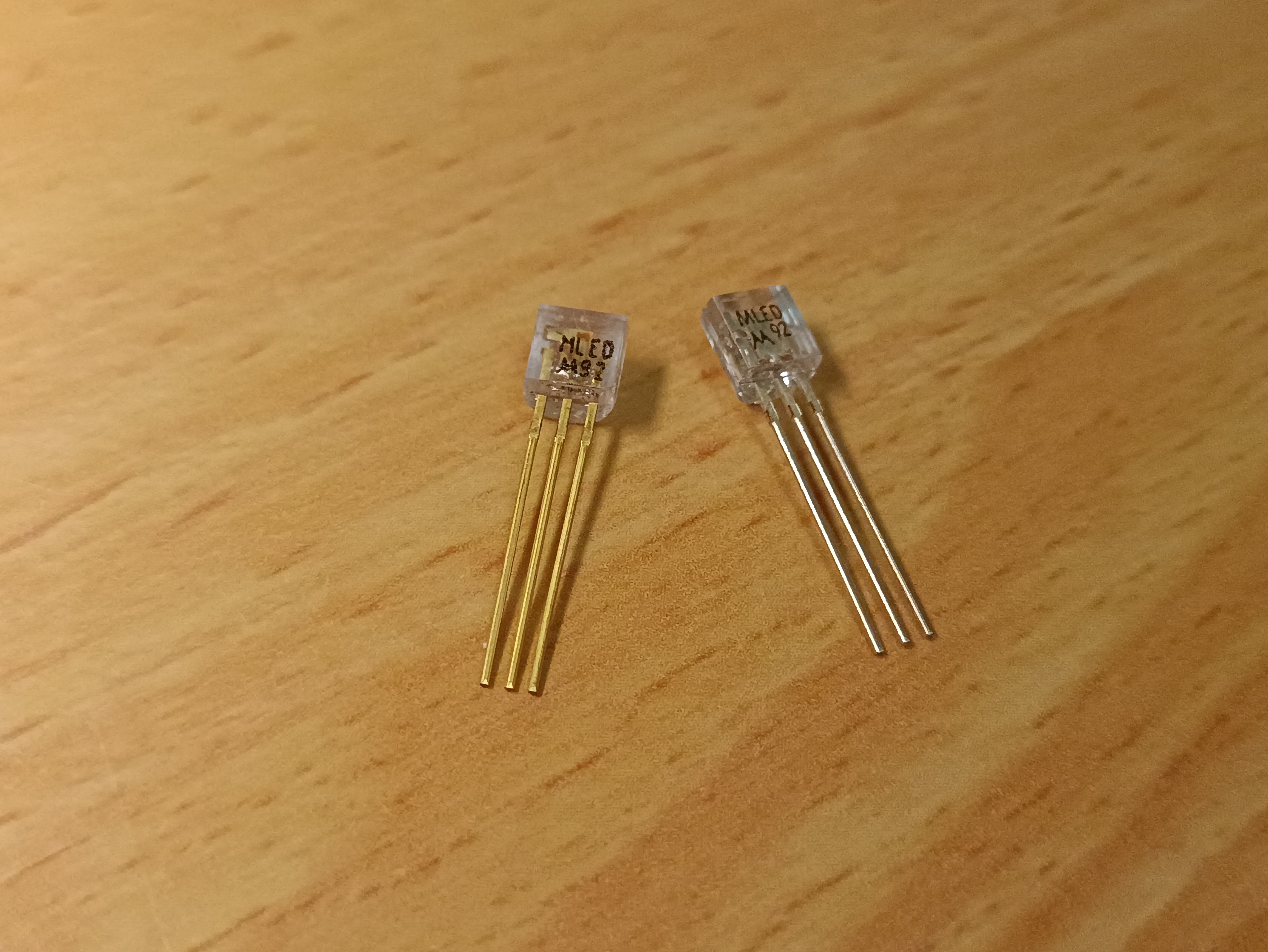 Infrared-emitting LEDs, in a transparent TO-92 package (a highly unusual case). Despite having a 3-pin TO-92 package like a transistor, these are 2-pin devices with the third pin internally disconnected