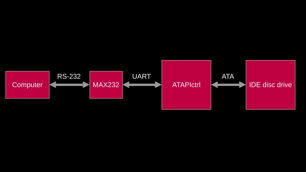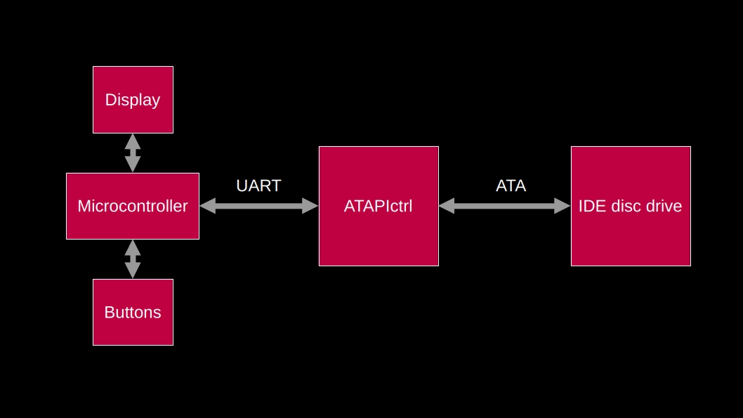 This project is similar to, and inspired by, the ATAPIduino project by Carlos Durandal, with a few differences. The ATAPIduino requires additional chips to provide more IO pins, and the connected Arduino bit-bangs the ATAPI protocol, while being able to simultaneously show track information on a display and read button inputs, effectively making a complete CD player. My ATAPIctrl project will be a single-chip board, and intended to be a drop-in module that simplifies communication with an IDE disc drive, but cannot be a CD player on its own and requires an external microcontroller to coordinate the operation. The benefit of my solution is that it is a general-case module that makes developing a DIY CD player easier, or can alternatively be connected to a vintage computer over a RS232 serial port, which will then be an interface for the CD player. Below are two diagrams of how it might be used/how I intend on using it.